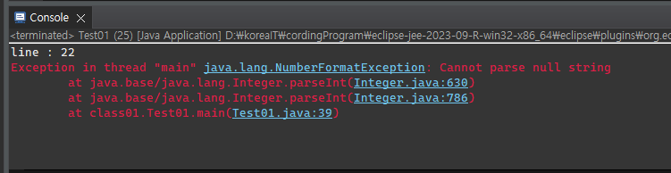 숫자 형식 오류로 Test01 클래스 39번 라인에서는 int 변수 = Integer.parseInt(값)을 사용했는데,