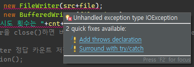 입출력 작업 때에는 IOException이 발생할 가능성을 항상 지니고 있기 때문에 try-catch 또는 throws를 통해 해당 예외를 처리할 것을 강제하고 있다.