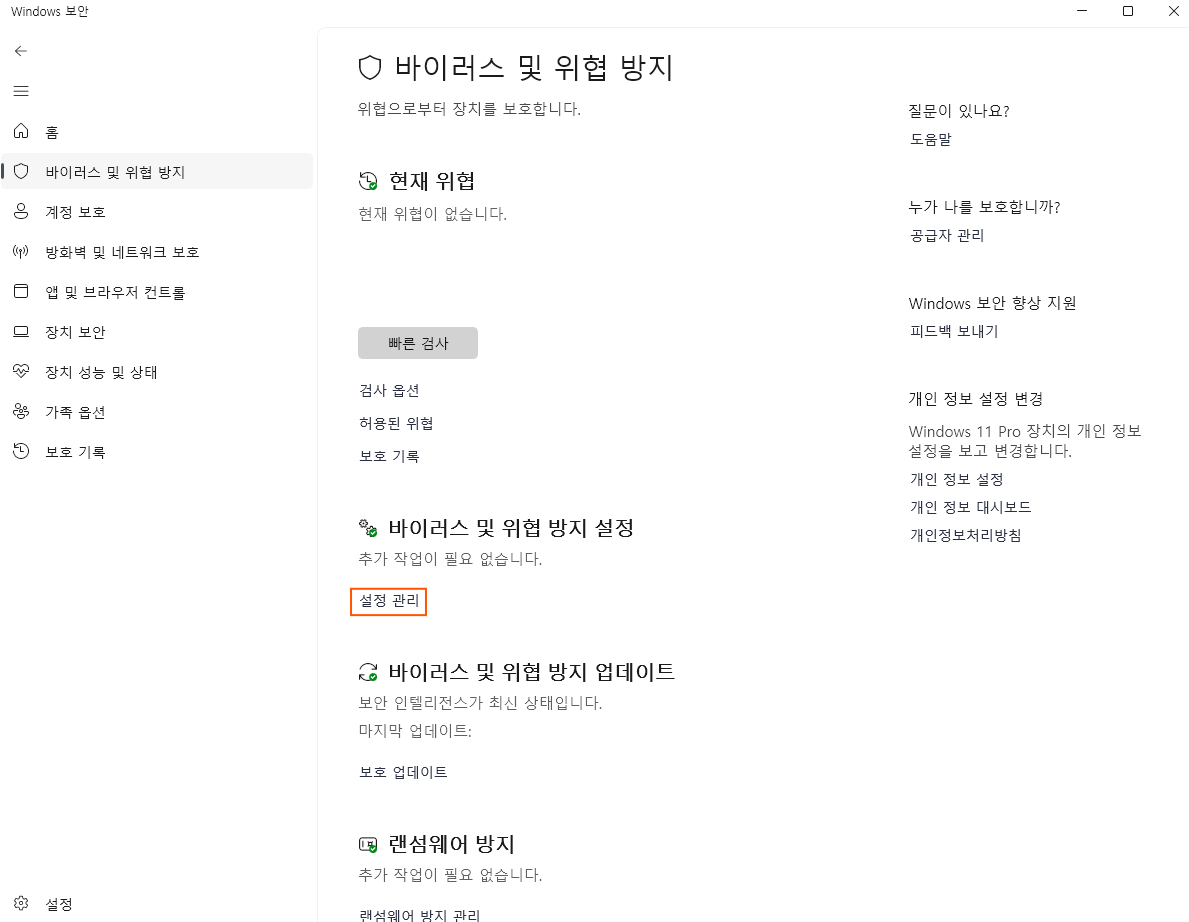 2. 바이러스 및 위협 방지에 들어가 설정 관리에 들어간다.