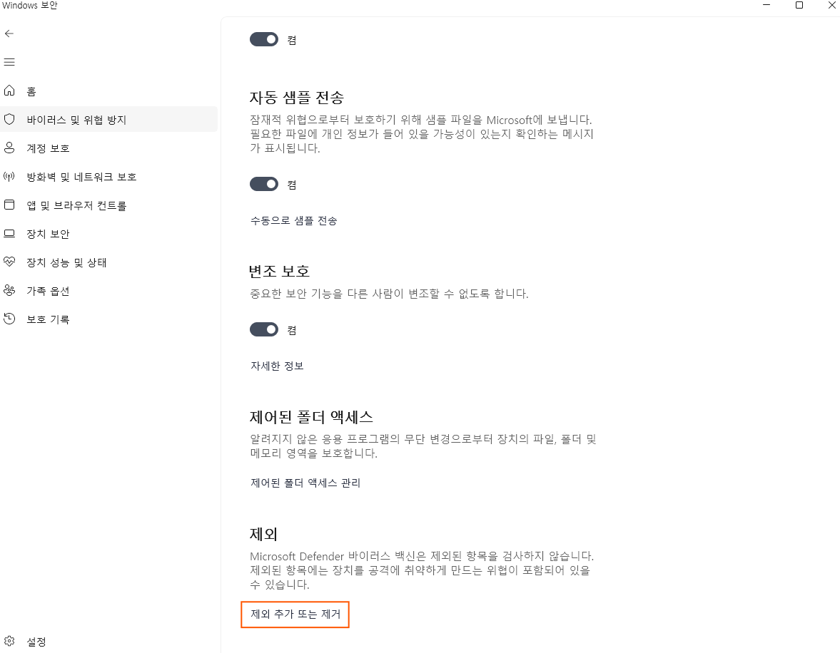 >>검사 제외 폴더 지정하기 (Windows 11)