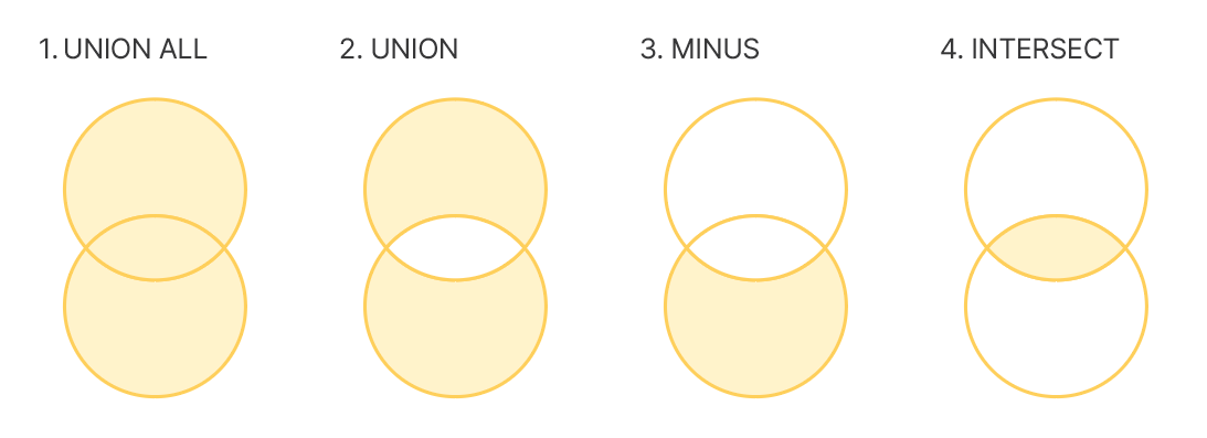 | MINUS | 위 아래의 SELECT문의 결과 값을 차집합으로 묶어주며, 상단 테이블의 결과 값 중 존재하지 않는 데이터만 하단 테이블에서 조회된다. |