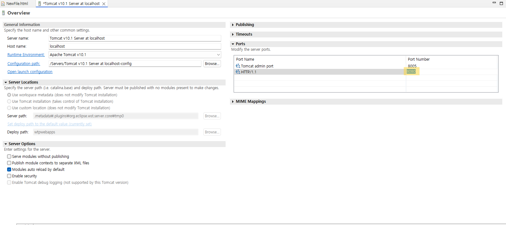 서버 설정에 들어가 포트 번호를 변경해주면 서버가 정상적으로 실행된다.