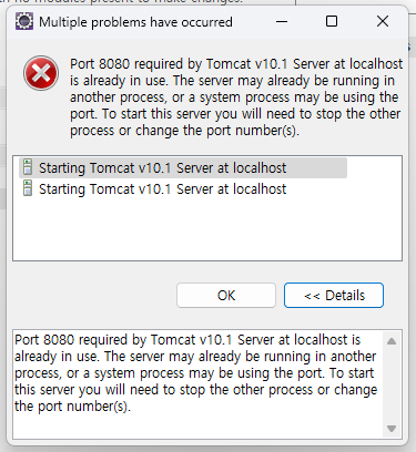 오류 메세지 기록 : Port 8080 required by Tomcat v 10.1 Server at localhost is already in use