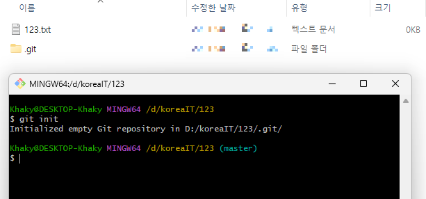 .git이라는 폴더가 생기며 브랜치 명이 경로 끝에 표시되면 성공이다. (현재 브랜치명 : master)