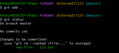 아직 깃 작업을 아무것도 하지 않은 파일을 untracked 상태로, 일단 깃 관리 대상으로 넣어 traked 상태로 변환시켜야한다.