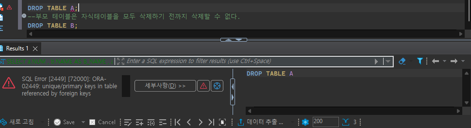 자식테이블을 먼저 삭제하거나 cascade constraints라는 명령어를 통해