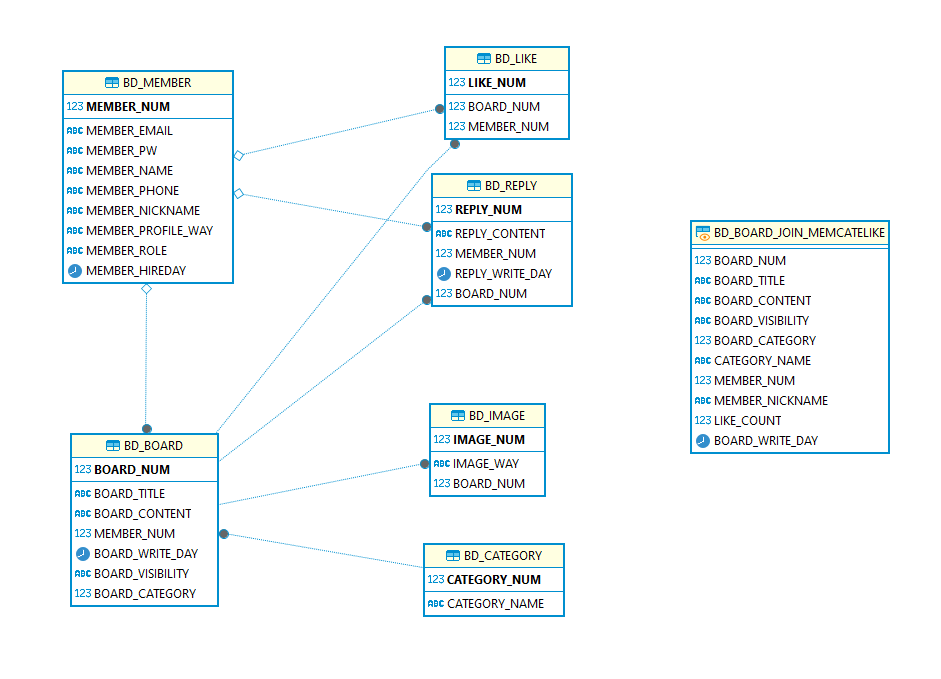 (제일 오른쪽은 view로 board정보를 반환할 때 여러가지 정보를 함께 반환하는 경우가 많아 쿼리 간략화 및 가독성을 위해 view를 추가했다)
