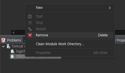 톰캣 실행 경로에서 발생하는 충돌에러가 날 수도 있어 해당 프로젝트 톰캣 서버 삭제 후 실행환경을 재구축 하는 방식으로, 서버에서 프로젝트를 내린 뒤 다시 서버를 실행해봤다.