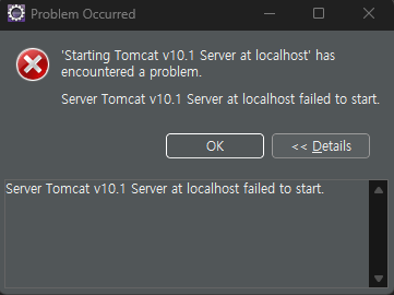 오류메세지 기록 : Server Tomcat v10.1 Server at localhost failed to start.