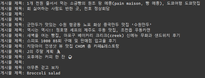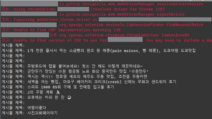 상단의 셀레니움이 실행되며 나오는 로그가 뜨고, 크롤링한 데이터가 출력되는 것을 확인할 수 있다.