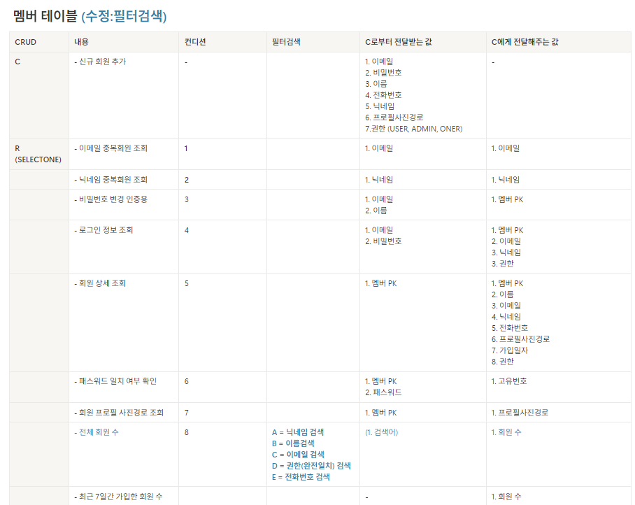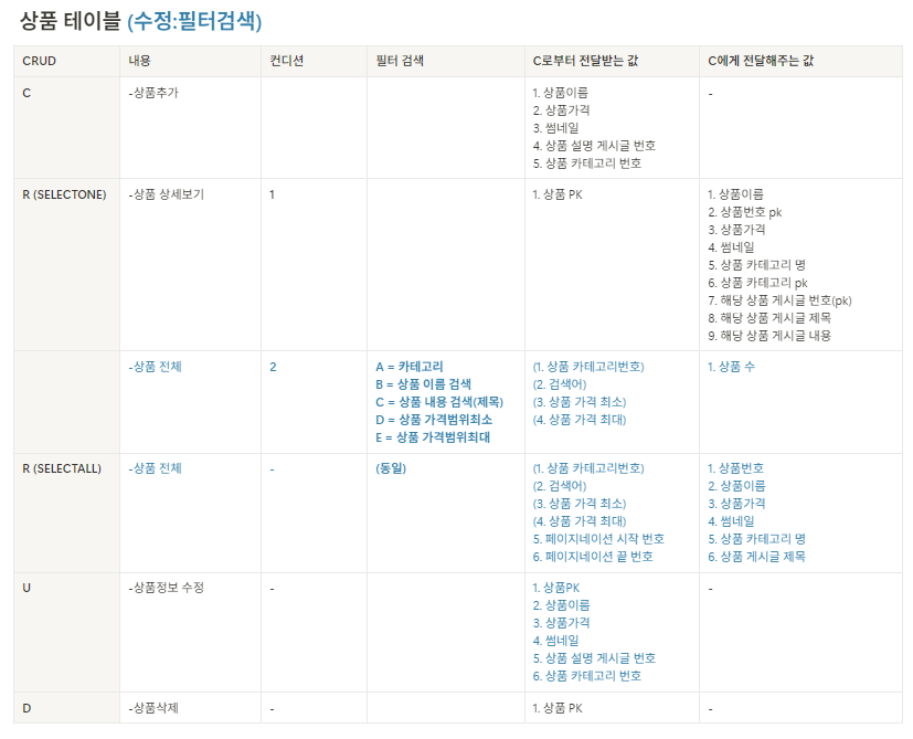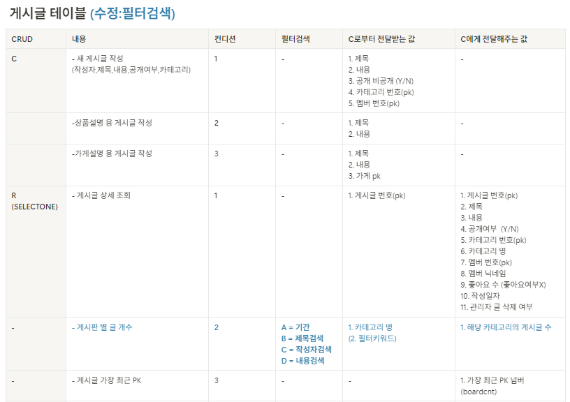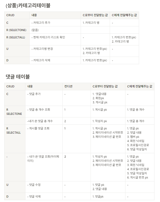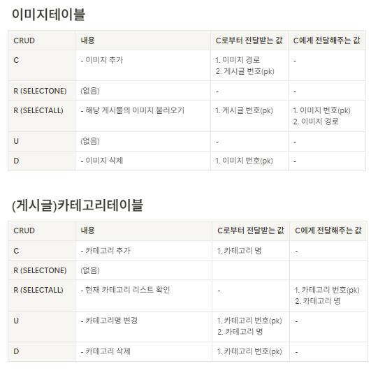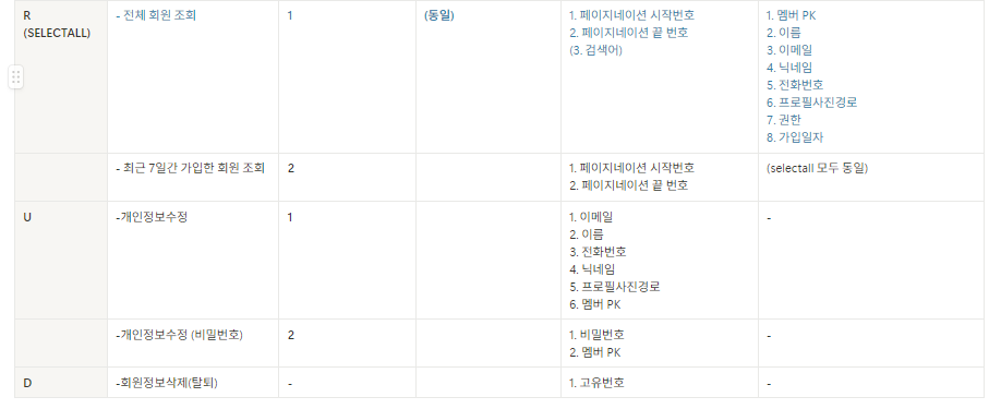 담당한 파트의 CRUD를 분석하고 Controller와 정보를 공유하기 위해 표를 만들었다.