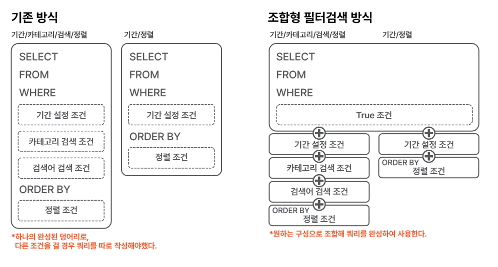 기존의 방식대로 했을 경우 검색어는 특별히 컨디션을 나누지 않는다고 하더라도, 카테고리 유무에 따라 2가지, 기간에 따라 (7일, 15일, 30일) 4가지를 곱해 모든 경우의 수인 8개의 컨디션 값이 나와야한다. 다른 검색 조건이 추가된다면 더욱 컨디션의 수가 늘어날 수 밖에 없는 구조이다. 특히 같은 쿼리문이 미세한 부분만 다르게 반복되므로, 효율이 떨어진다.