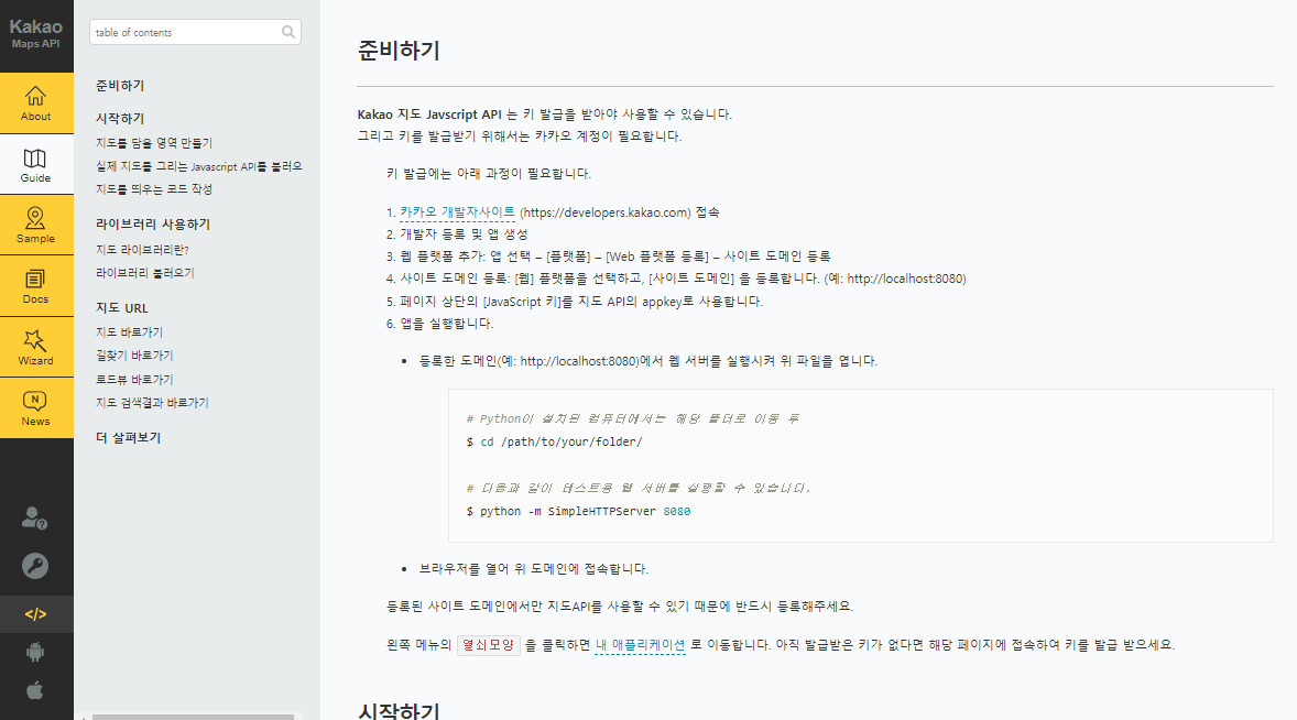 카카오 지도 api는 카카오 자체 설명이 자세하게 나와있다. 바로 사용가능한 예시 코드까지 작성해서 알려주고 있으므로 공식페이지를 읽어보는 것을 추천한다.
