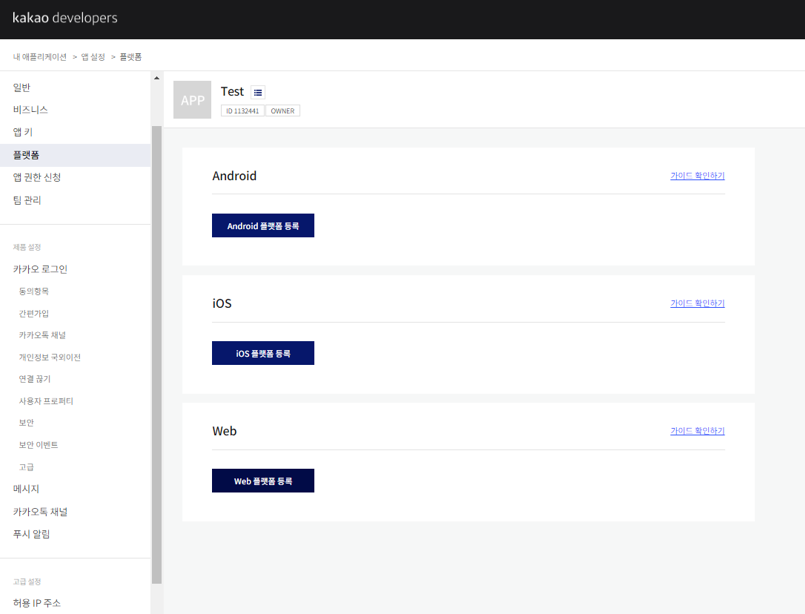 4. 만든 어플리케이션에 들어가서 [플랫폼] - web 플랫폼 등록하기