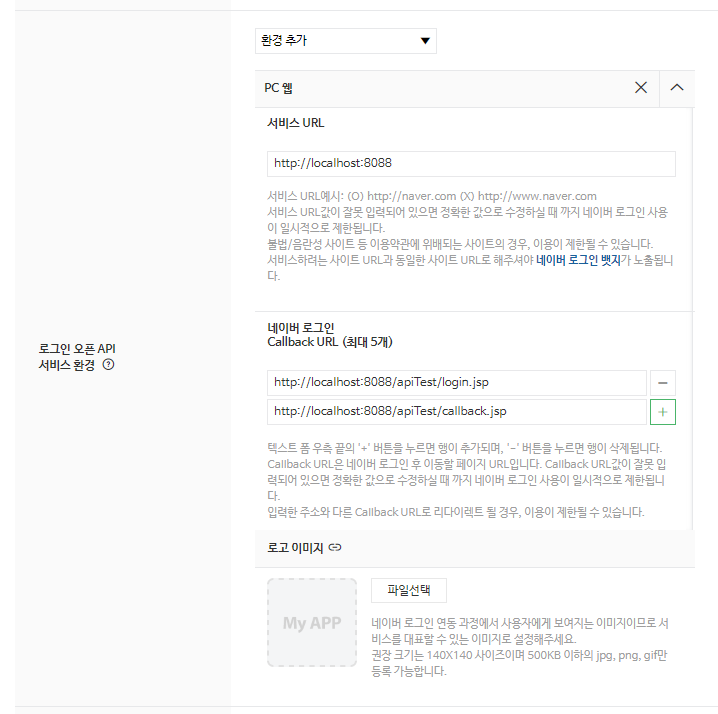 그리고 서비스 환경에서 PC 웹을 골라준다. 이때 콜백 URL이 될 수 있는 모든 URL을 적고, 서비스 URL에는 도메인을 작성하면된다. 이 때 처음 등록할 때 잘 등록해야 후에 이유없는 오류로 고생하지 않을 수 있다.