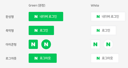 네이버 로그인은 애플리케이션에 사용할 수 있는 네이버 로그인 버튼 기본 이미지를 제공합니다. 애플리케이션의 상황에 맞게 버튼 이미지의 디자인을 변경할 수 있지만 네이버 고유의 아이덴