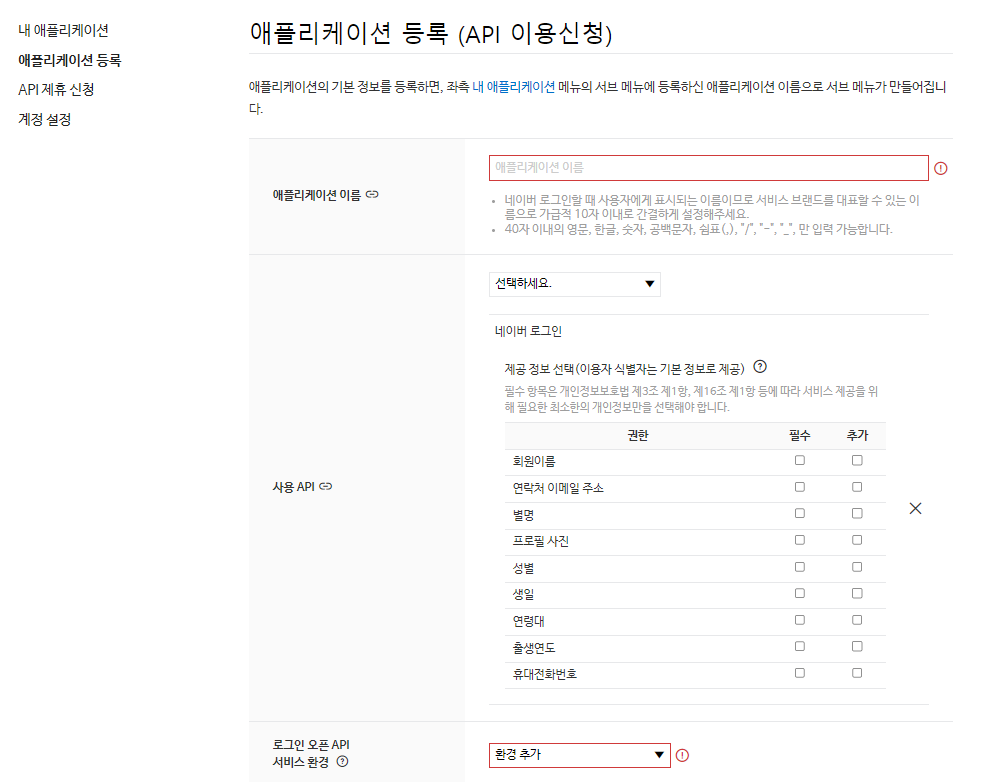 그럼 바로 네이버로그인 api 신청이 추가된 애플리케이션 등록창이 뜬다.