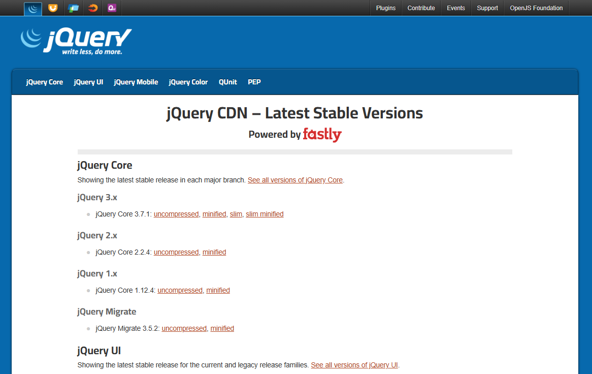 jQuery CDN – Latest Stable Versions jQuery Core Showing the latest stable release in each major branch. See all versions of jQuery Core. jQuery 3.x jQuery 2.x jQuery 1.x jQuery Migrate jQuery UI Showing the latest stable release for the current and legac