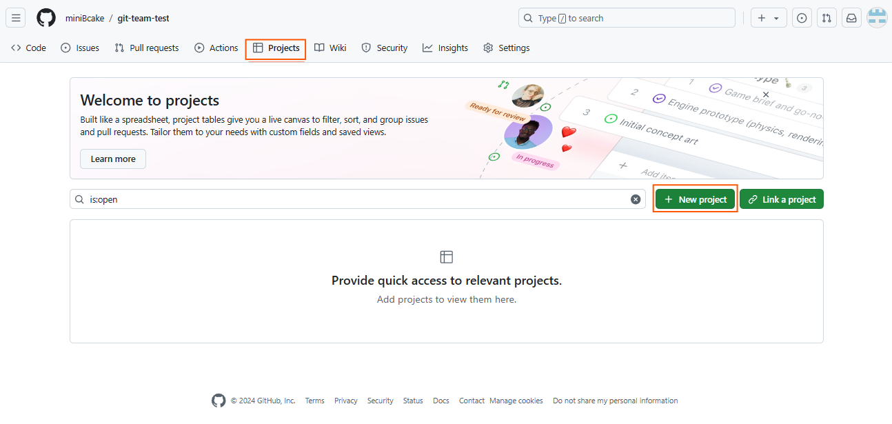 먼저 프로젝트를 진행할 리포지토리가 필요하다. 이 리포지토리를 만드는 방법은 일반 리포지토리를 만드는 방법과 동일하다.