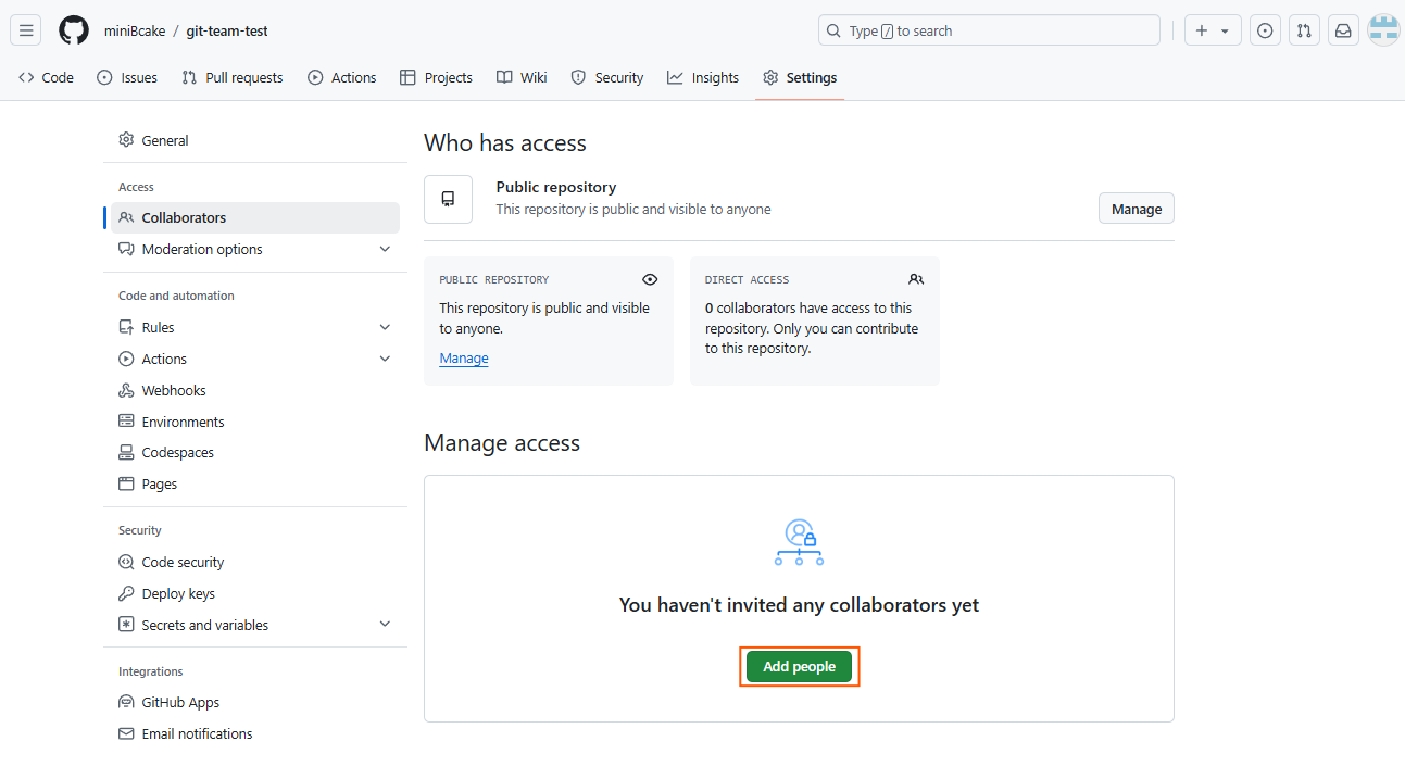 리포지토리를 보면 invite collaborators 버튼이 있다. 해당 버튼을 클릭하면 Manage access로 이동한다.