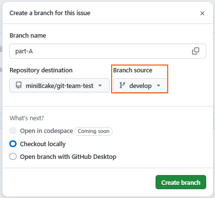 Development에서 Create a branch를 누르면 해당 issue의 브랜치를 생성할 수 있다.