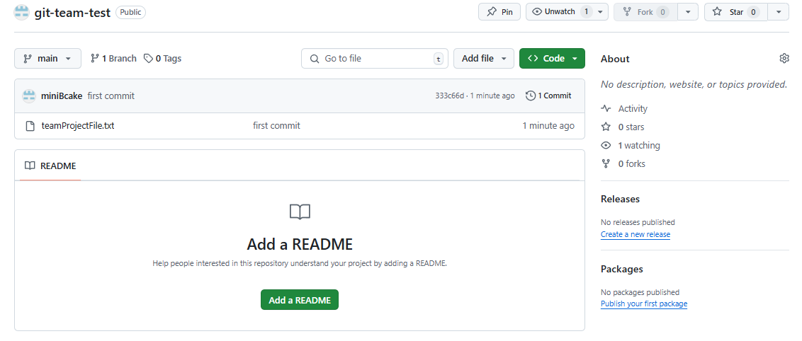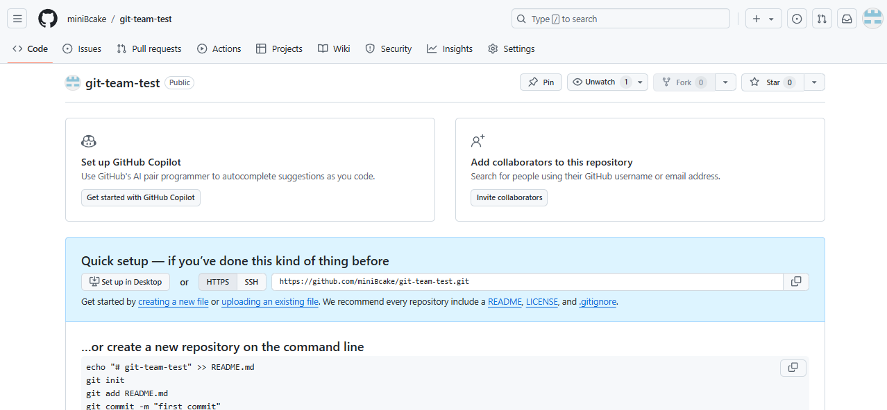 (git-team-test라는 이름으로 팀 프로젝트를 진행할 리포지토리를 만들었다.)