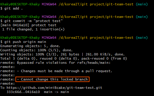 이제 main브랜치에서 수정 후 push를 하면 push가 불가능한 것을 확인할 수 있다.