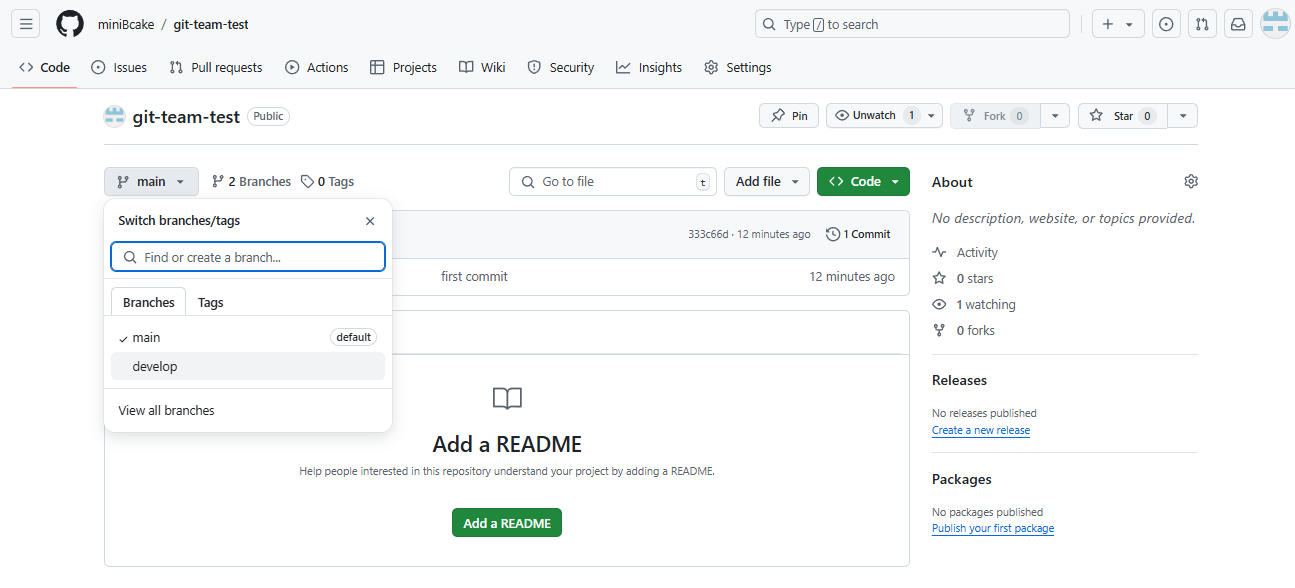 git checkout -b develop 명령어를 생성하면 로컬 브랜치가 추가되는 동시에 develop 브랜치로 전환된다.