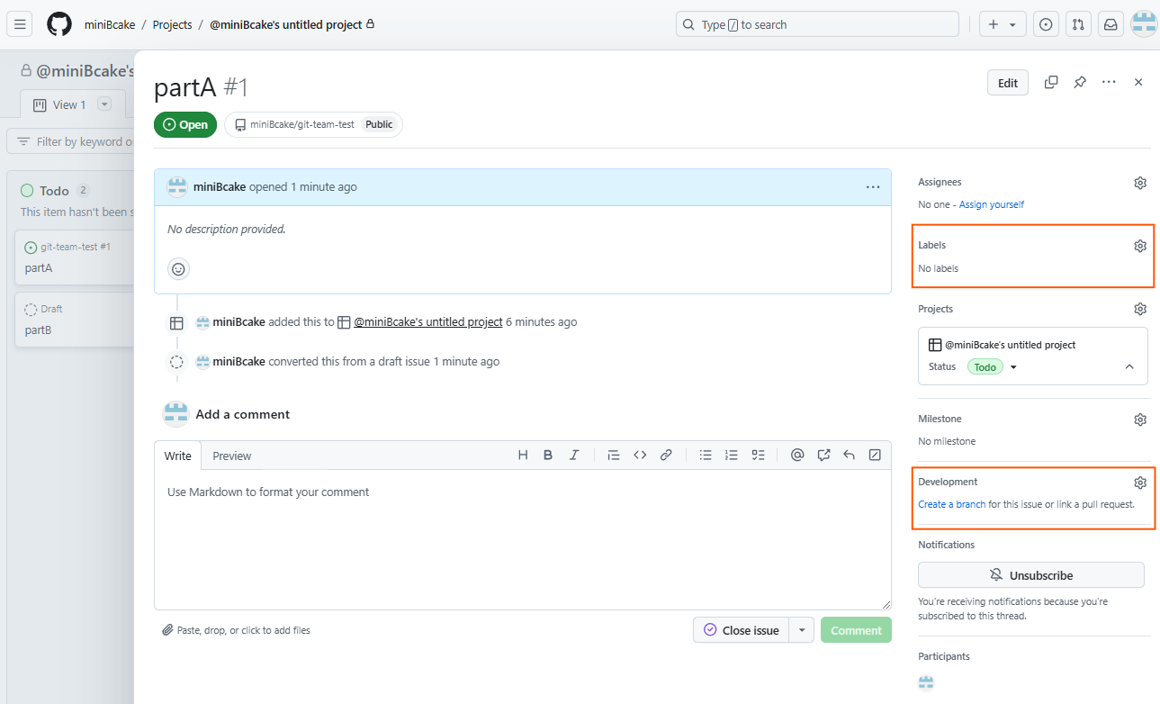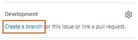 Development에서 Create a branch를 누르면 해당 issue의 브랜치를 생성할 수 있다.