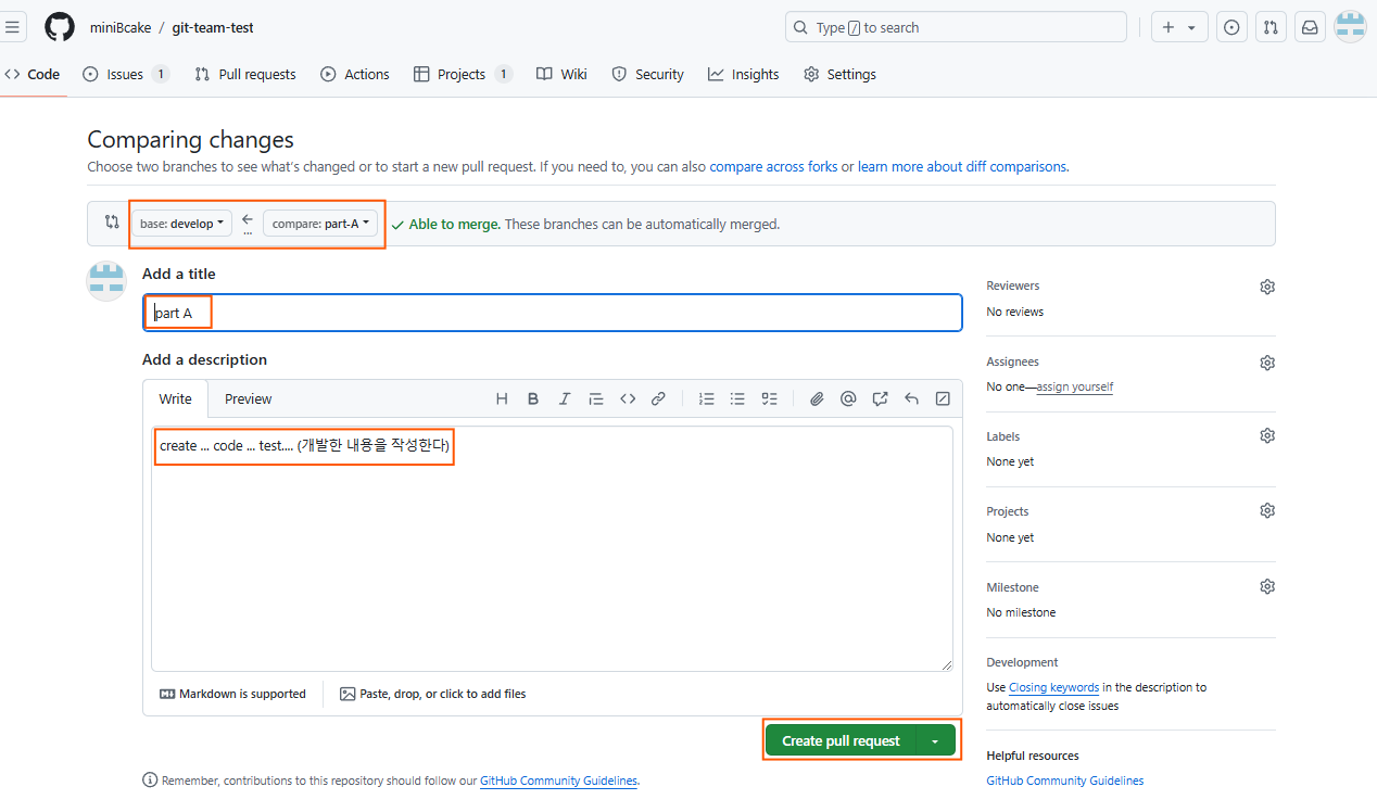 PR(pull request)에 들어가면 어느 브랜치의 내용을 어느 브랜치로 보낼지와 개발 내용을 작성할 수 있는 부분이 있다.