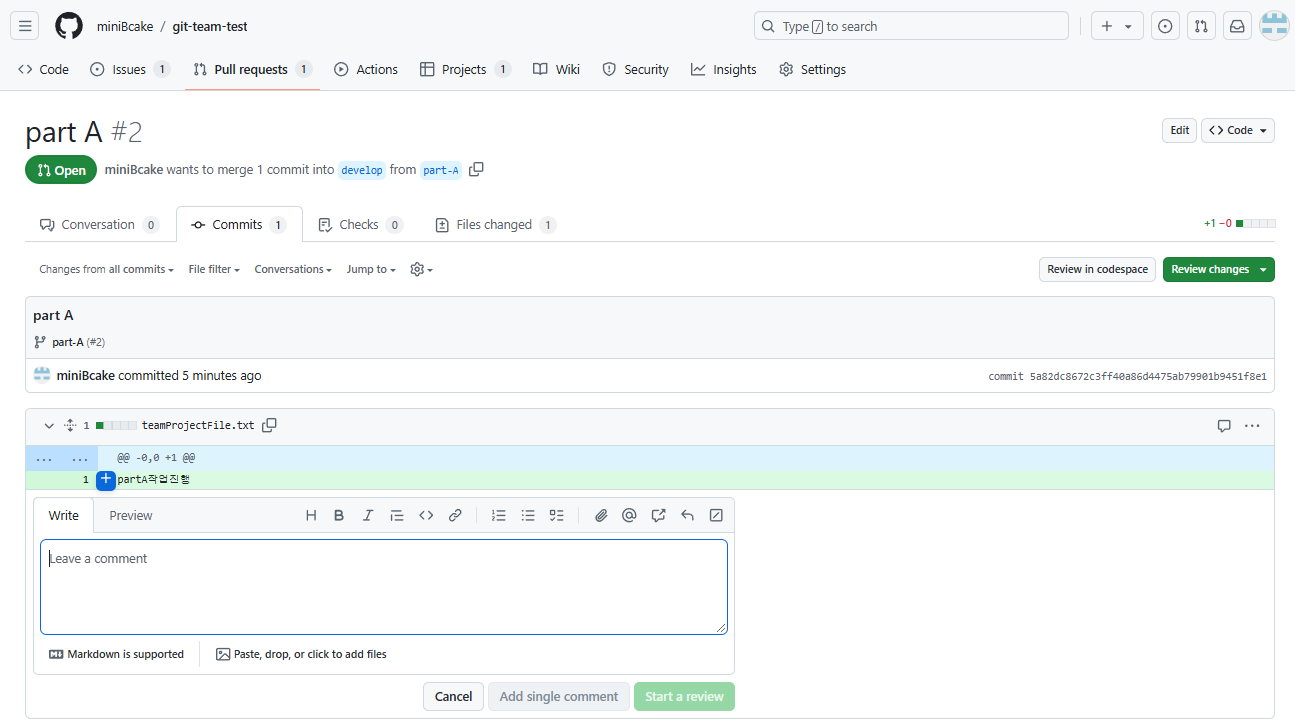 보낸 PR을 클릭하면 리뷰창이 뜨고 코드 옆에 +을 눌러 코멘트를 남길 수 있다.