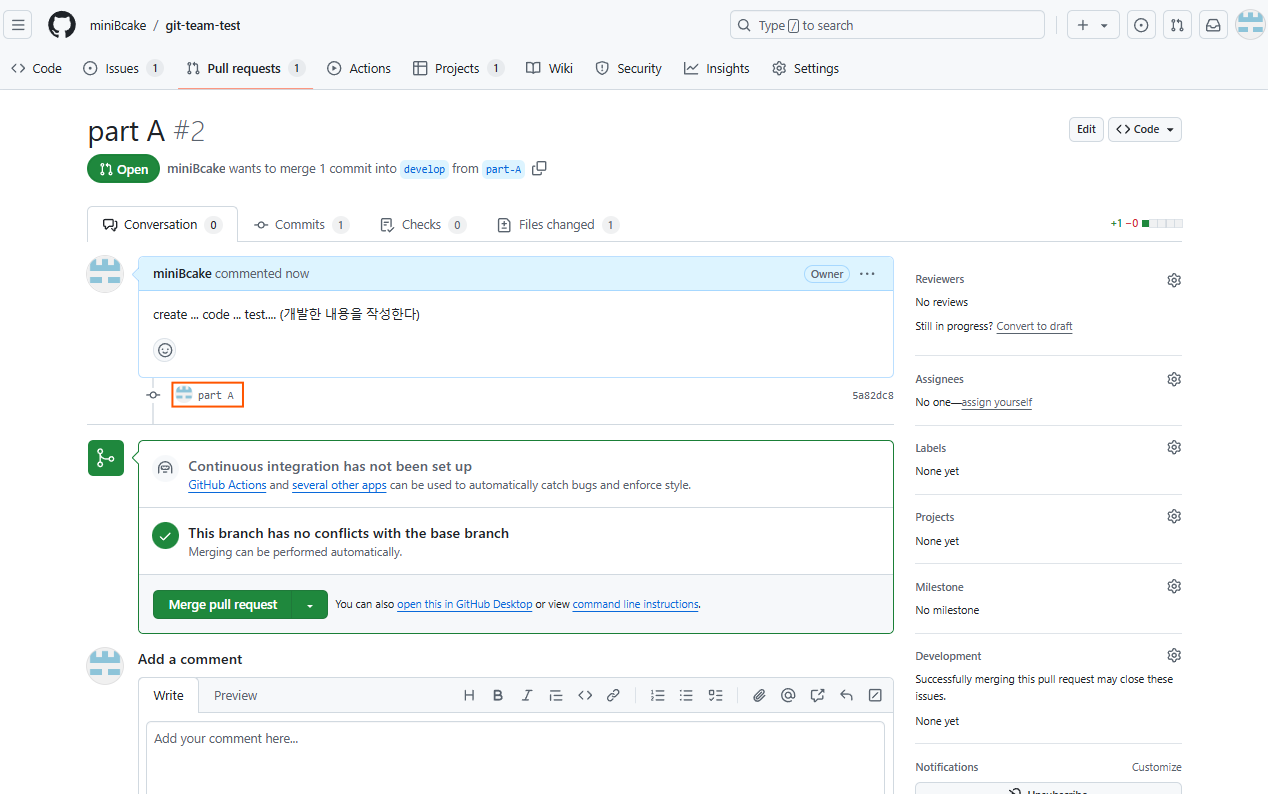 이때 develop 브랜치로 보내야한다는 것을 잊지 말고 잘 체크해야한다.