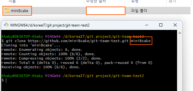 프로젝트를 진행할 로컬 폴더에서 git clone 팀프로젝트깃주소 이름을 통해 클론작업을 진행할 수 있다.