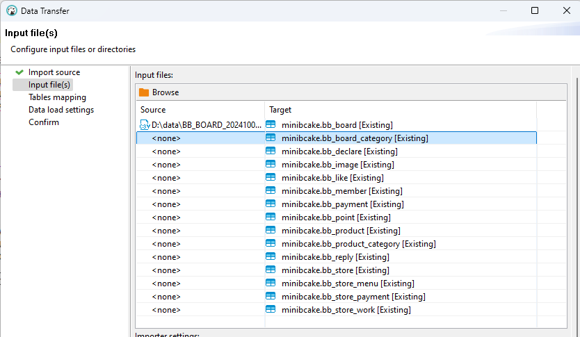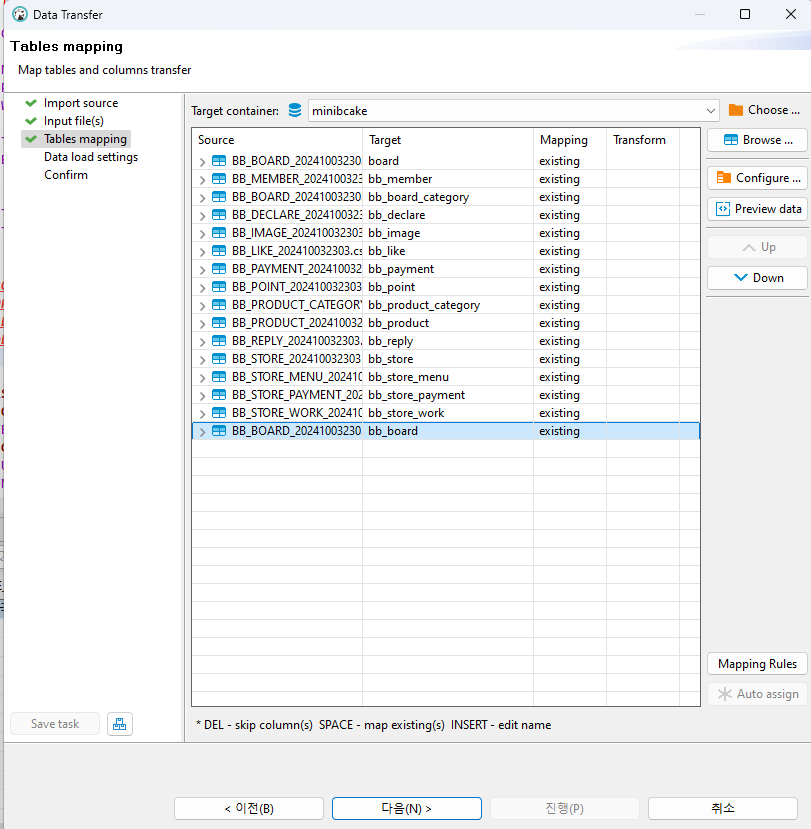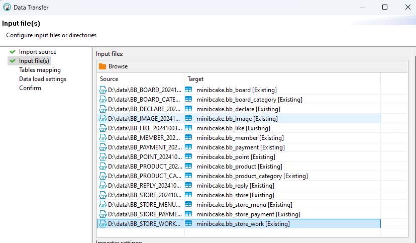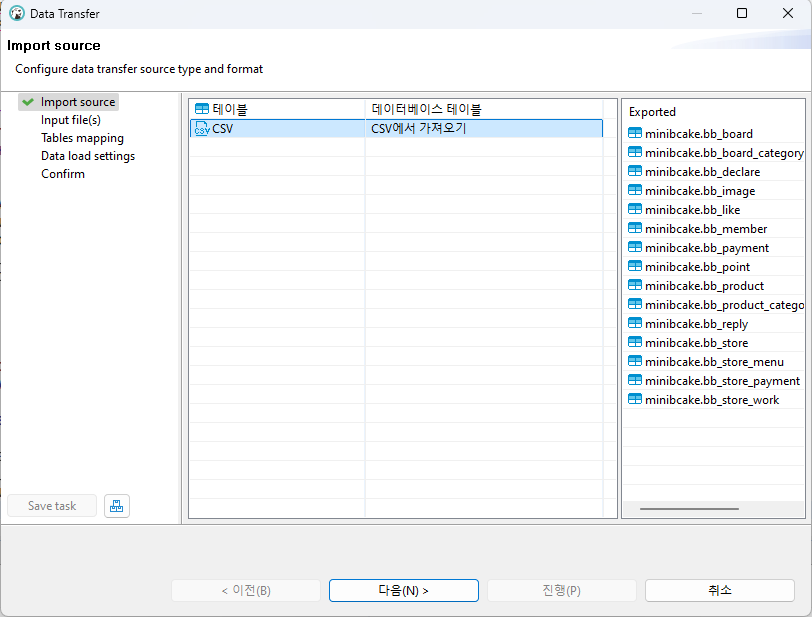 5. 아까 export한 CSV파일을 알맞은 테이블에 넣어준다.