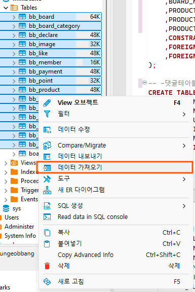 3. 내보내기를 마쳤으면 데이터를 옮길 테이블을 선택한 후 가져오기를 누른다.