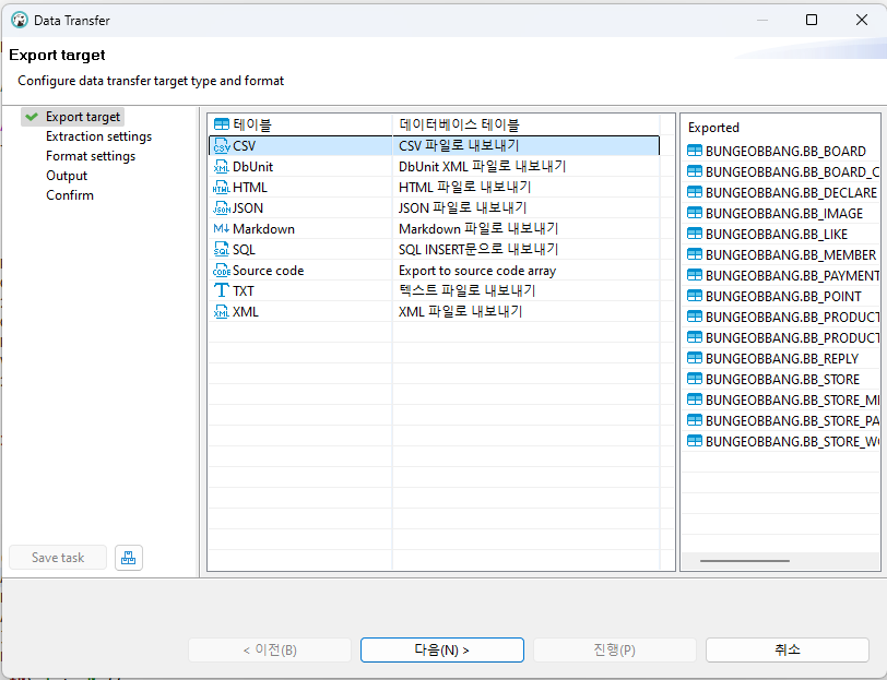 1. 데이터를 이관할 테이블을 선택한 뒤 데이터 내보내기를 한다.