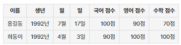 이름,생년,월,일,국어 점수,영어 점수,수학 점수