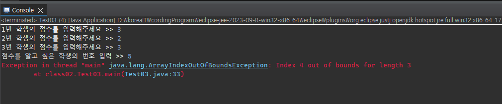 배열의 길이는 3인데 index값으로 4가 들어왔다는 오류메세지이다. (배열 범위 초과)