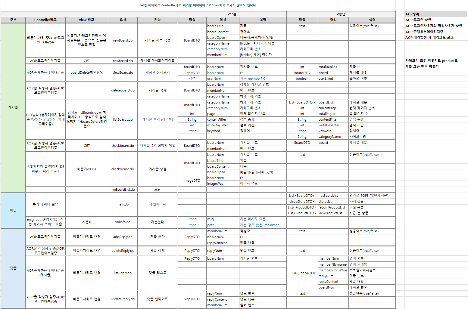이관 후 로직 수정을 진행하는 게시글, 메인, 댓글, 상품(상품은 수정 후 다른 Controller 파트 팀원에게 인계 예정) 그 외에 새로 로직을 구성할 가게 파트를 담당하고 있으며, AOP, Filter 등 공통 기능 처리를 담당해 진행할 예정이다.