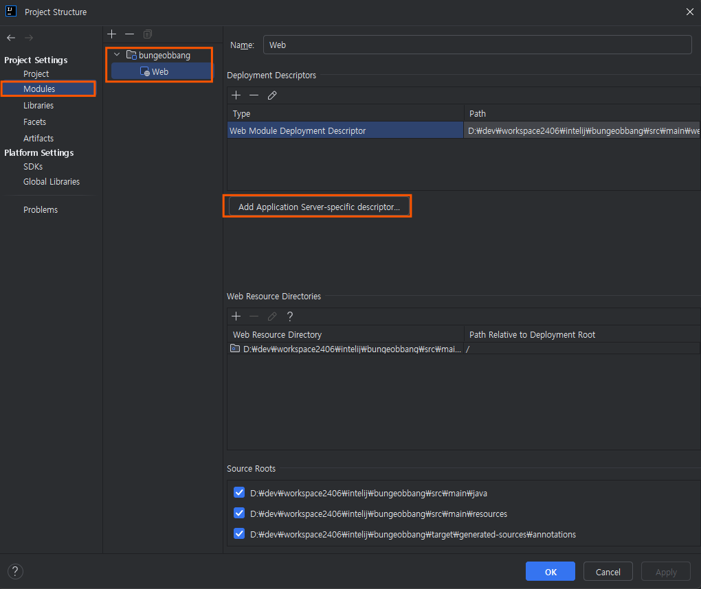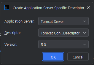 modules에서 프로젝트를 열고 web을 선택해 Add Application Server-specific descriptor...을 선택한다.