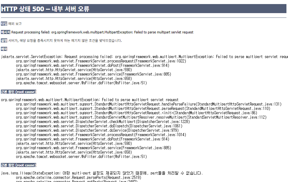 해당 에러는 여러가지 문제로 발생한다. 코드에 이상이 없다는 가정하에 해당 문제가 반복된다면 서버(톰캣)설정을 추가해야한다.'