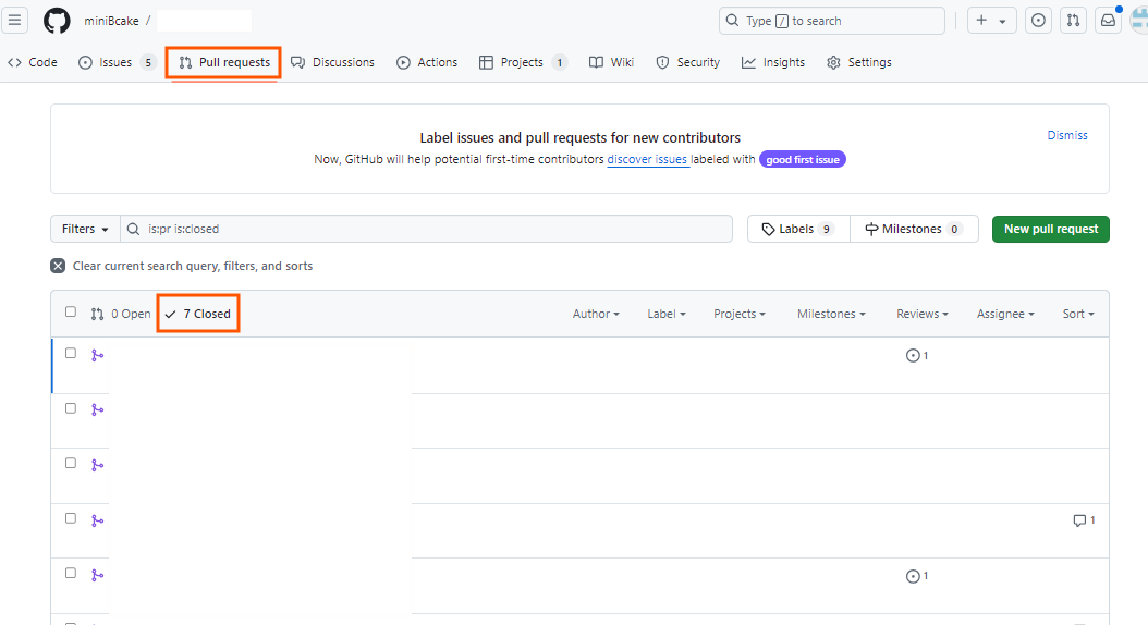 Pull requests에서 closed(이미 merge된 pr)을 선택하면 작업 완료된 PR을 확인할 수 있다.