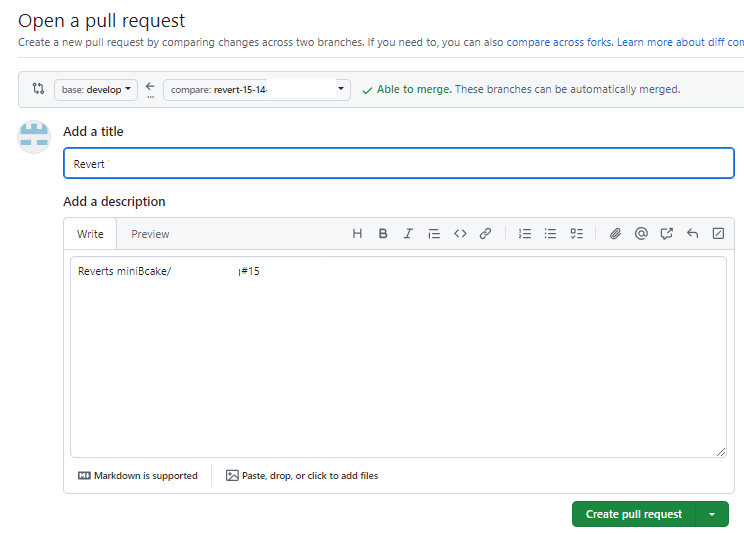 이는 변경사항을 되돌리는 PR이므로 되돌릴 브랜치로 PR이 갈 수 있게하면된다. 자동 설정되므로 확인만 한 번씩 하면 된다.