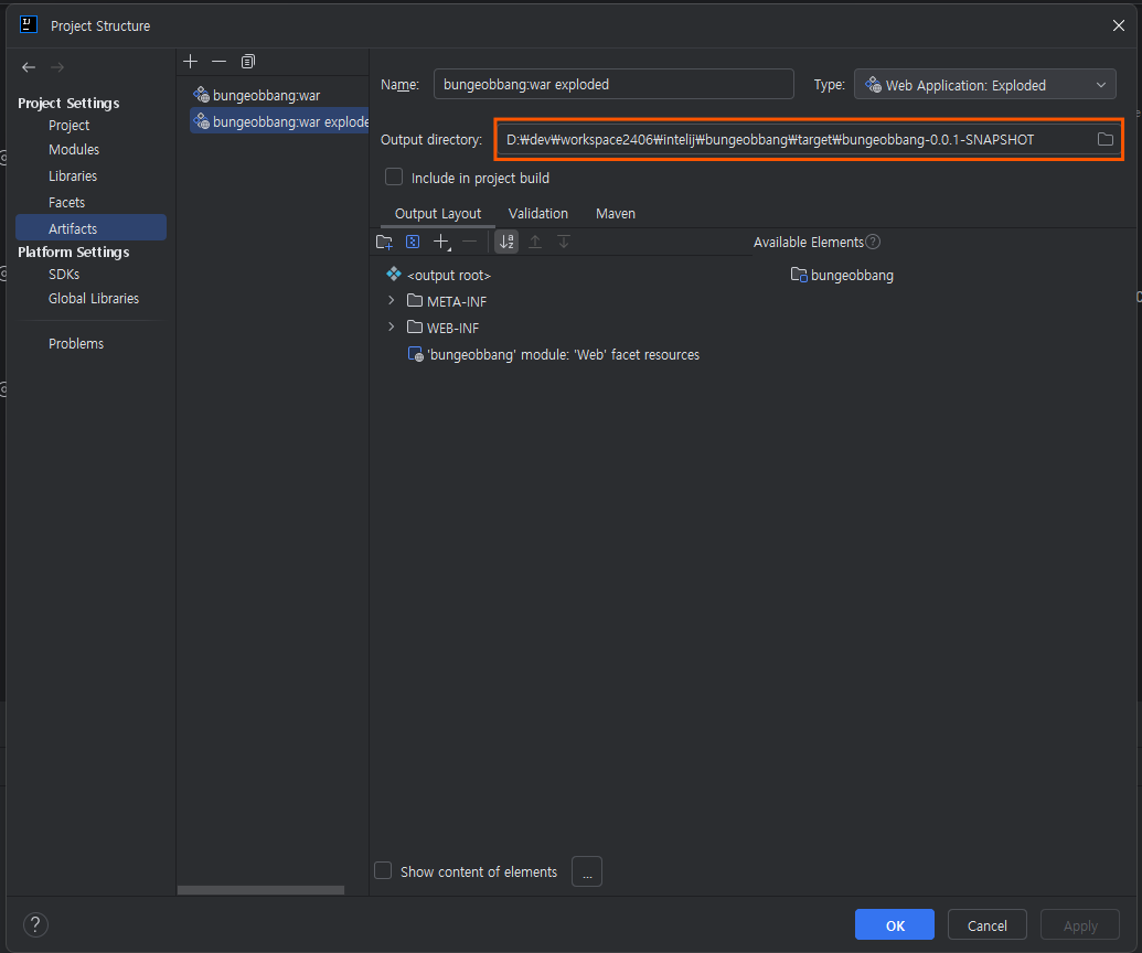 target 폴더로 지정되어있는 것을 확인할 수 있다. 이 부분을 webapp으로 변경하기만 하면 된다.