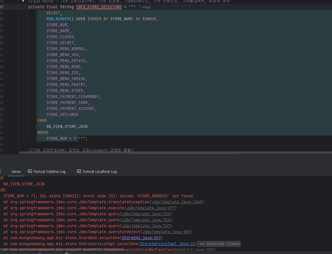 STORE_NUM = ?]; SQL state [S0022]; error code [0]; Column 'STORE_ADDRESS' not found.