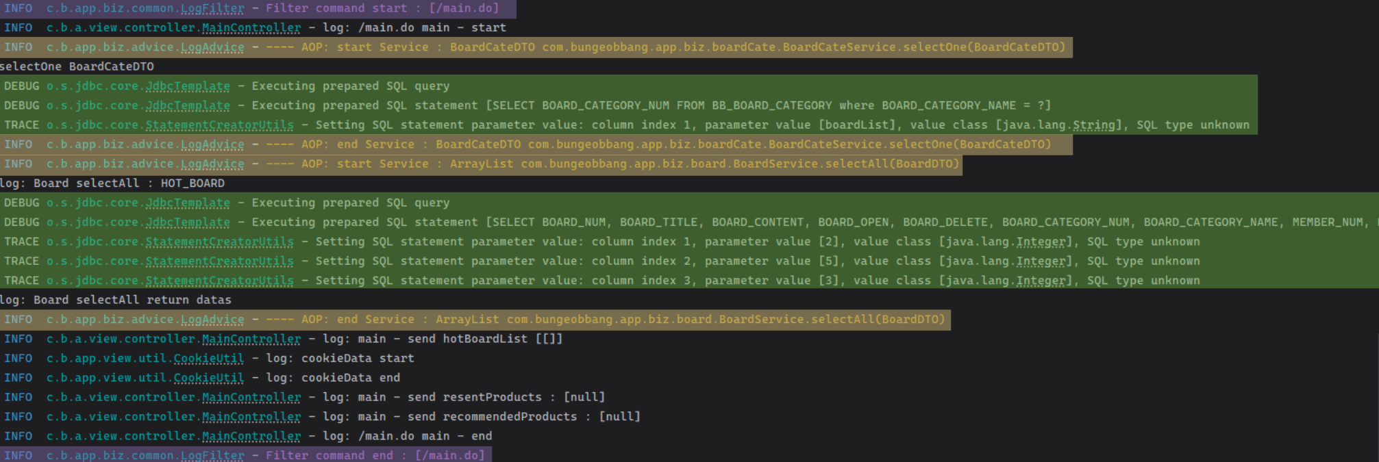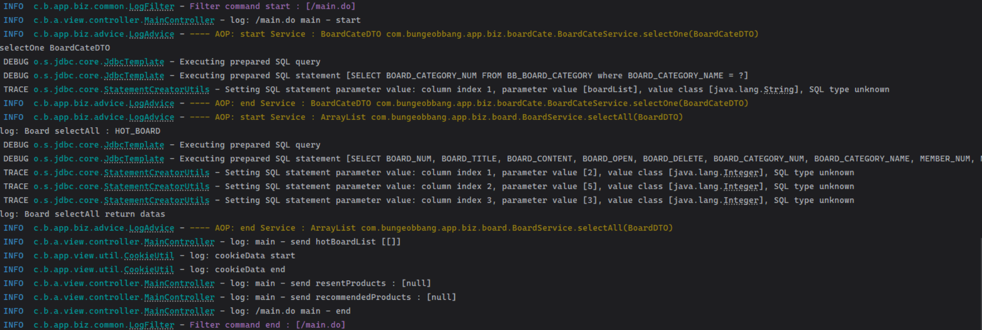 MVC 파트를 나눠 횡단으로 작업을 진행한 후 종단 작업을 통해 기능을 연결하고 오류를 해결하게 되는데, 각각의 로그 스타일이 다르고 JDBCTemplate를 사용하게 되며 로그를 남길 수 있는 부분도 많이 줄어들게 되었다. 이로 인해 종단 작업 시 코드를 하나하나 살펴봐야하는 문제, 또는 새롭게 로그를 남겨야하는 문제가 발생하게 되어 자동 로그에 대해 필요성이 생기게 되었다.