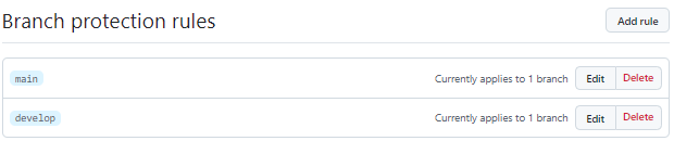 브랜치마다 각각의 역할이 있고, 지켜야하는 룰이 있기 때문에 git-hub rule 기능을 통해 실수하더라도 룰에 의해 진행되지 않도록 적용했다.
