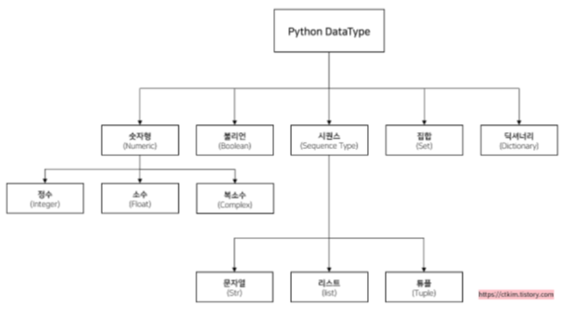 주로 사용되는 자료형은 5개로 숫자형(Numeric), 불리언(Boolean), 시퀀스(Sequence Type), 집합(Set), 딕셔너리(Dictionary)이다.
