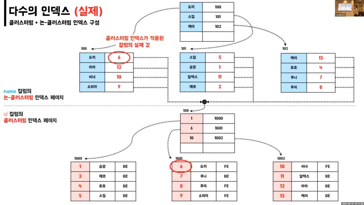 클러스터란 무리, 군집의 뜻을 가지고 있으며, 클러스터링은 실제 데이터와 무리를 이루는 것을 의미한다. 즉, 논-클러스터링은 실제 데이터와 무리를 이루지 않는 것을 의미한다. 다시말해 클러스터링 인덱스는 실제 데이터와 같은 무리의 인덱스를 의미한다. 실제 데이터가 정렬된 사전같은 느낌이다. (ㄱㄴㄷ) B-Tree의 리프 페이지가 데이터 페이지와 동일하다.