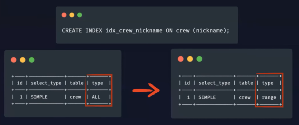 nickname에 인덱스를 걸었으며, type이 range로 바뀐 것을 확인할 수 있다.